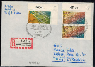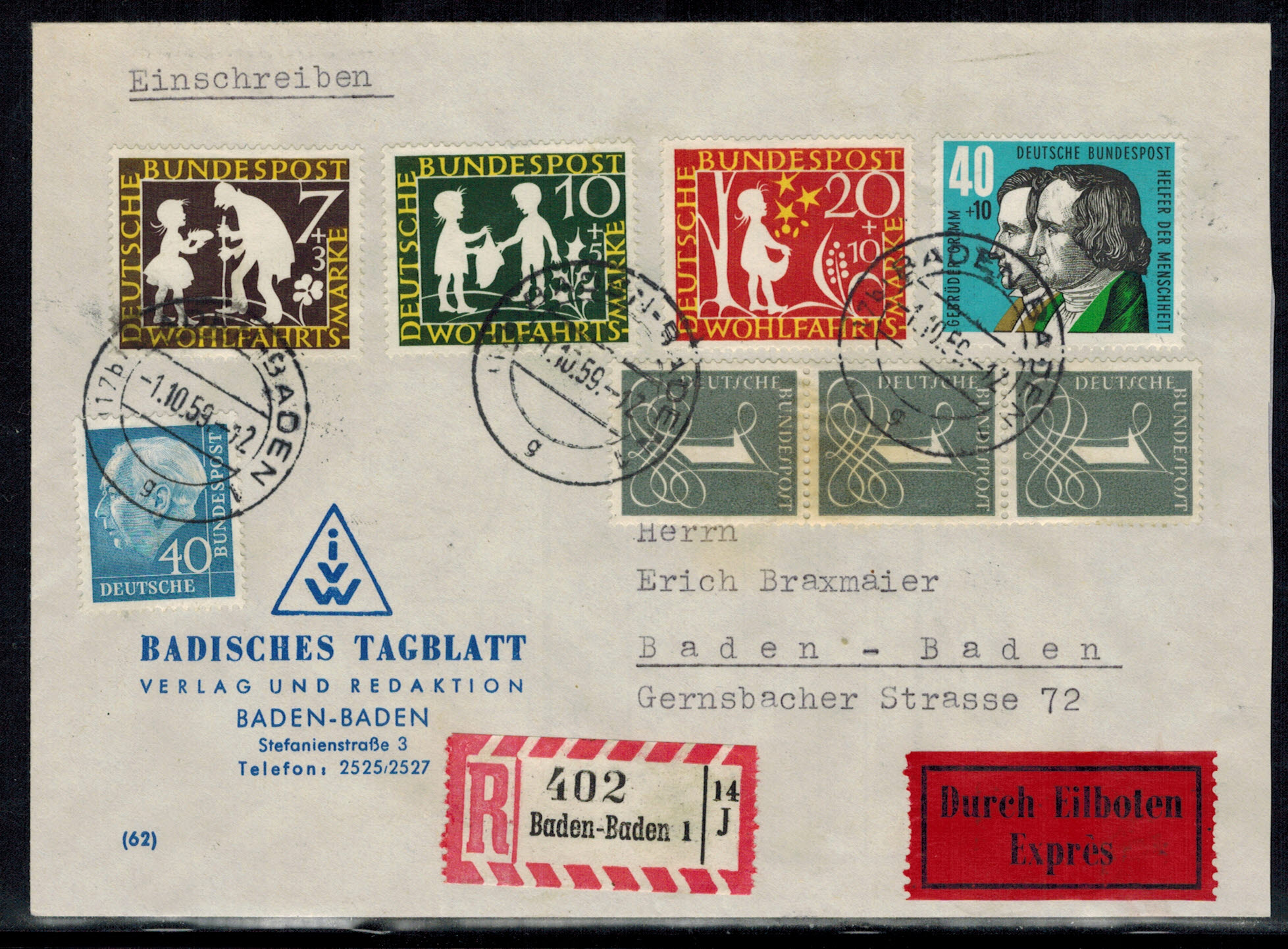 Bund 0322 – 325 kompletter Satz als MiF auf portogerechtem Ersttags-Eilboten-Einschreibenbrief !