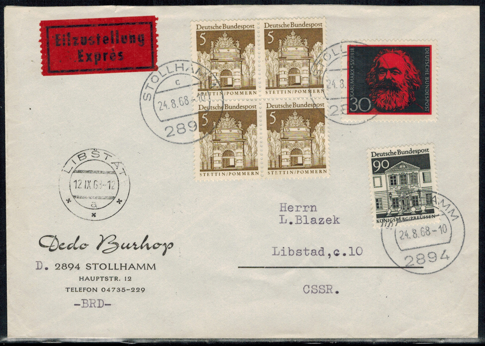 Bund 0489 4-er Block als MiF auf portogerechtem Eilzustellungsbrief !!