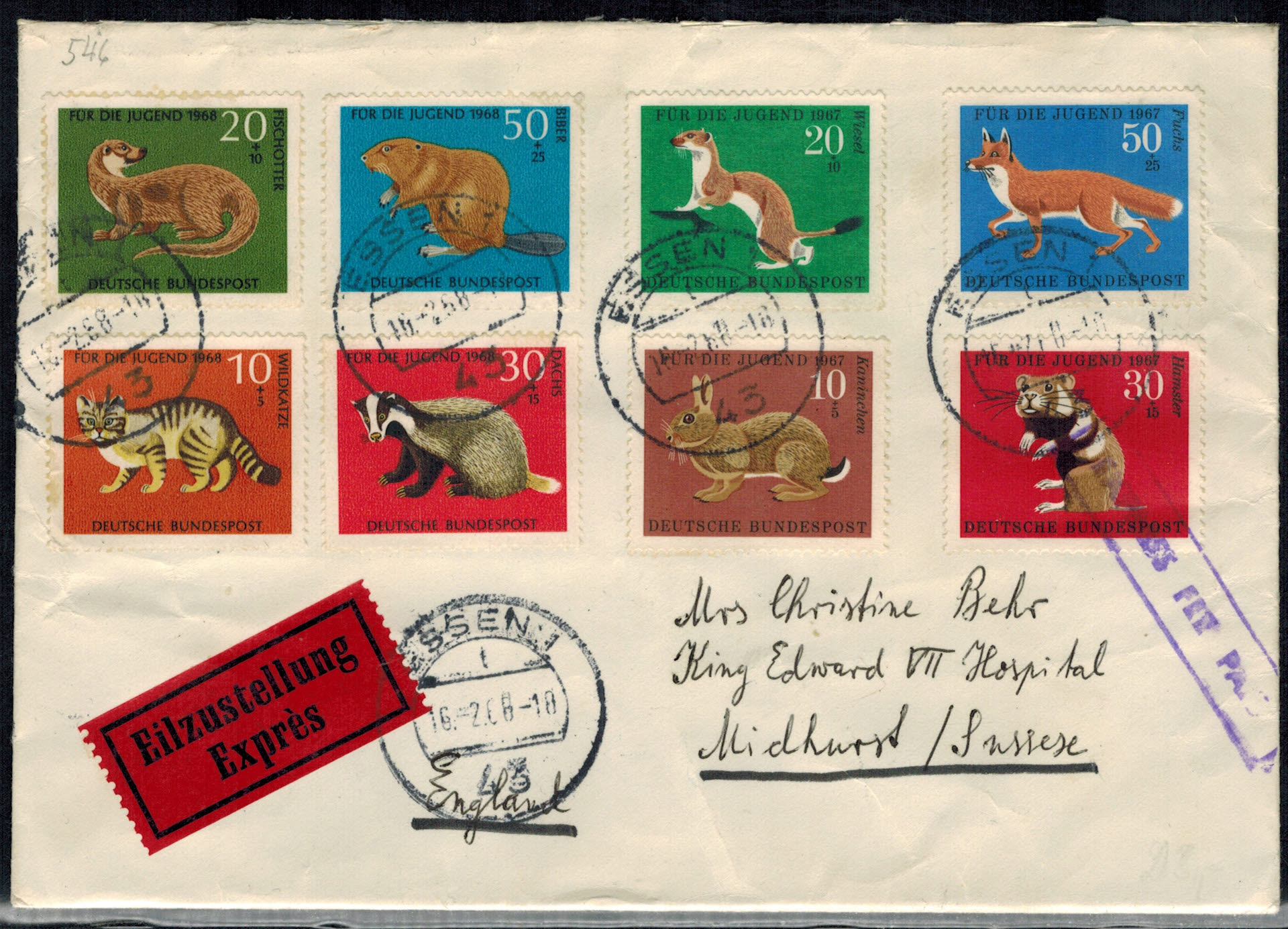 Bund 0549 – 552 mit Zusatzfrankatur 529 – 532 auf schönem Eilbotenbrief nach England !