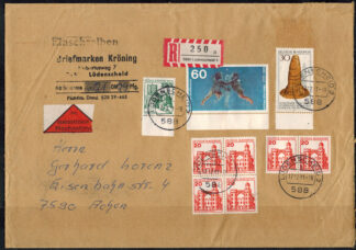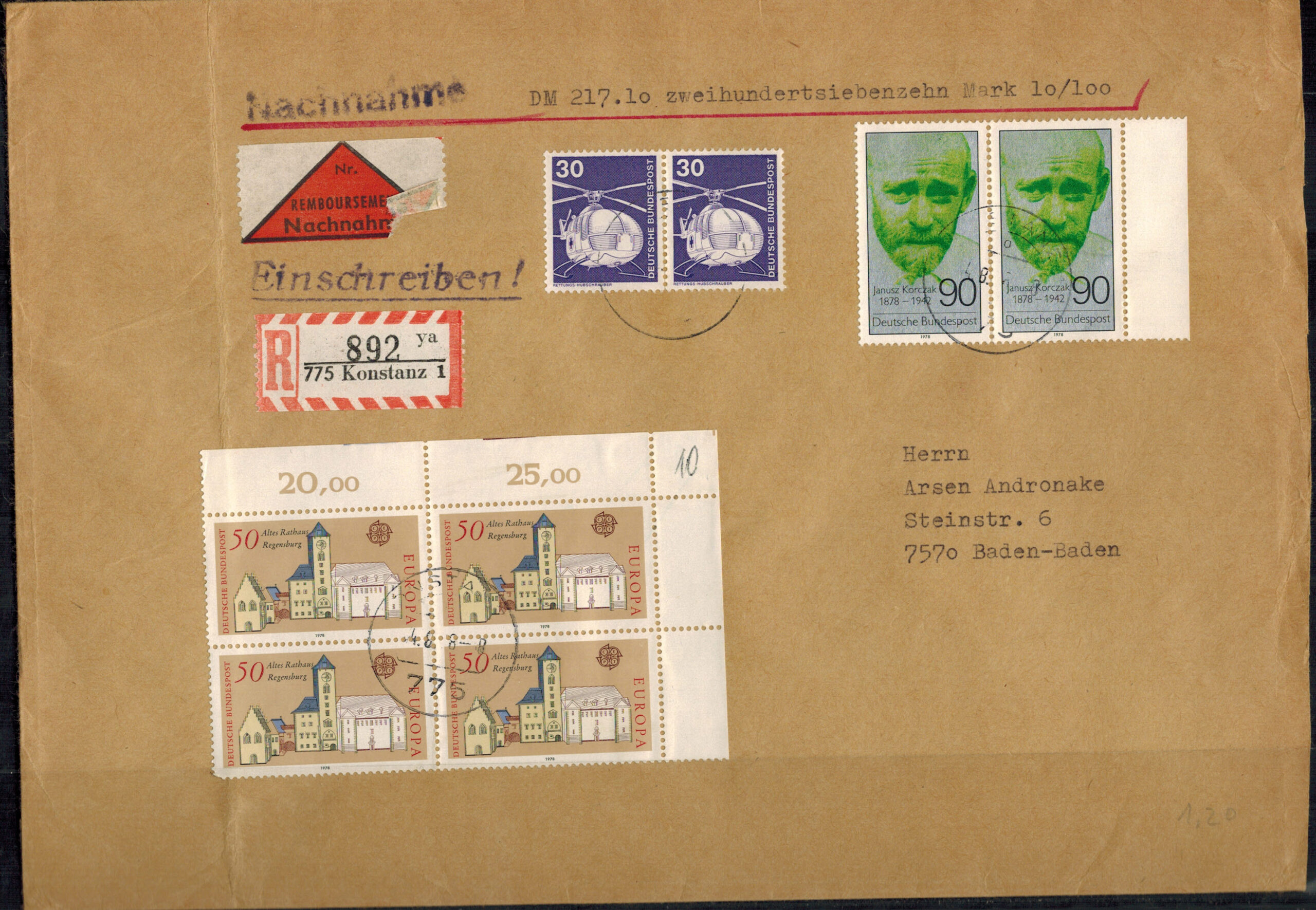 Bund 0970 4-er ER-Block r.o. mit farbigen Keil+ 973 waagr. Paar SR r. als MiF auf Einschreiben-Nachnahmenbrief !