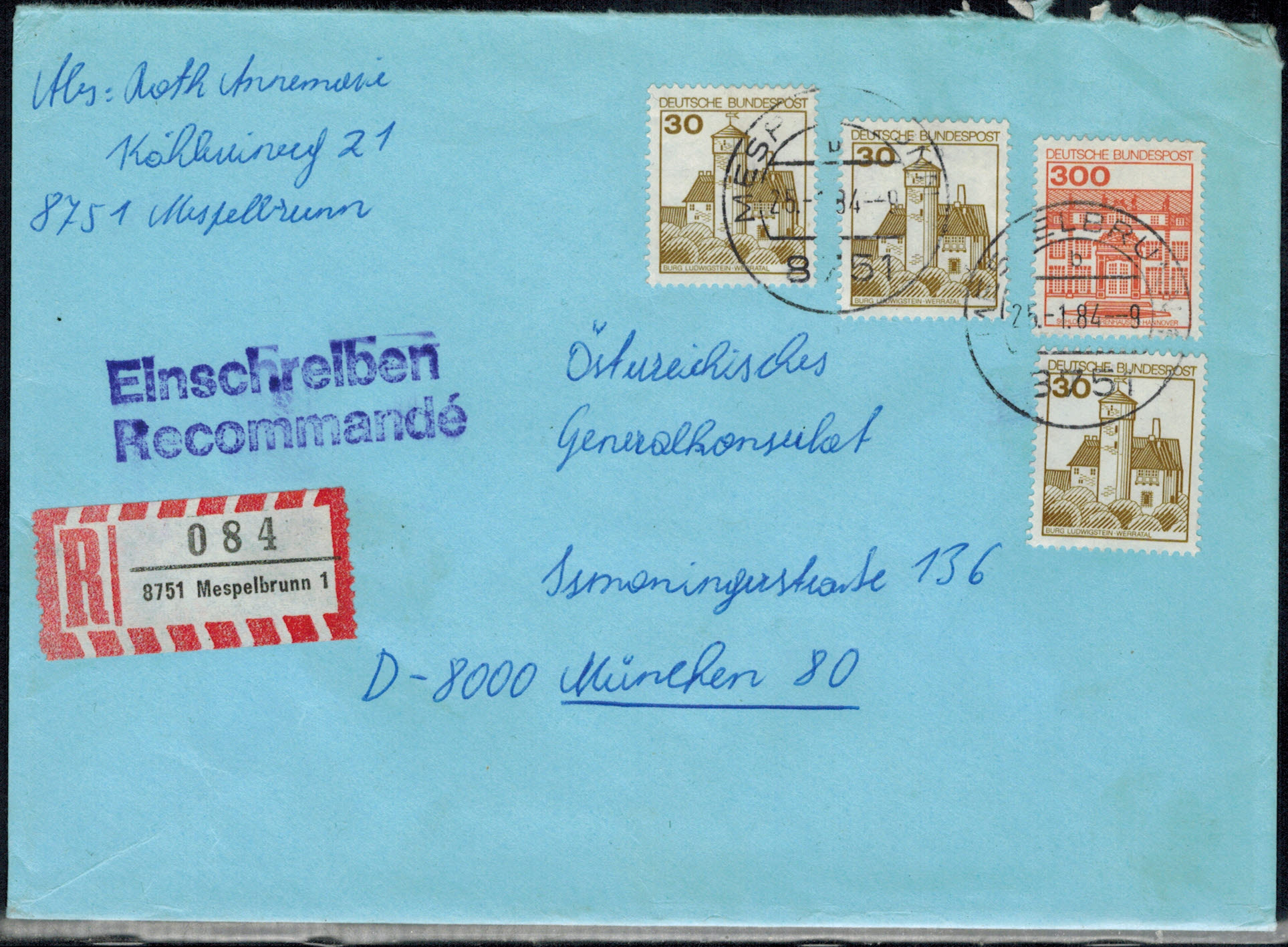 Bund 1034 als MiF auf portogerechtem Einschreibenbrief !!