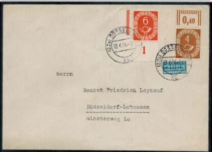 Bund 124 + 126 auf portogerechtem Brief ! Die 4 Pf.-Marke mit Eckrand links oben, die 6 Pf.-Marke Eckrand links unten ! Stempel „Düsseldorf 13.4.54-9“
