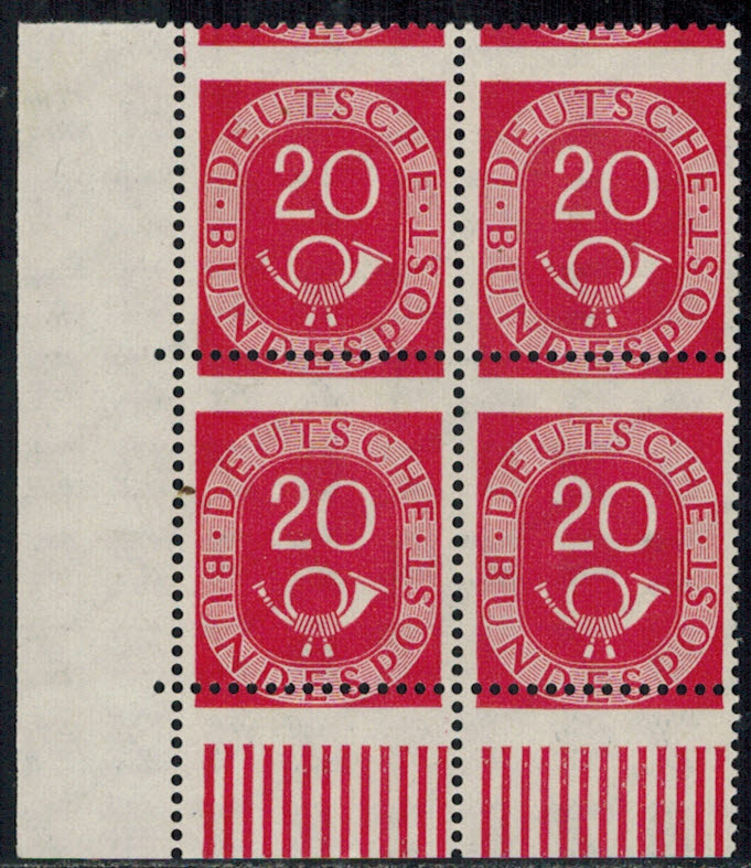Bund 130 Eckrand 4-er Block l.u. mit Zähnungsabart: „durch totale Verzähnung zwischen den Marken ungezähnt“ wahrscheinlich UNIKAT !!!  Jede einzelne Marke geprüft Schlegel !