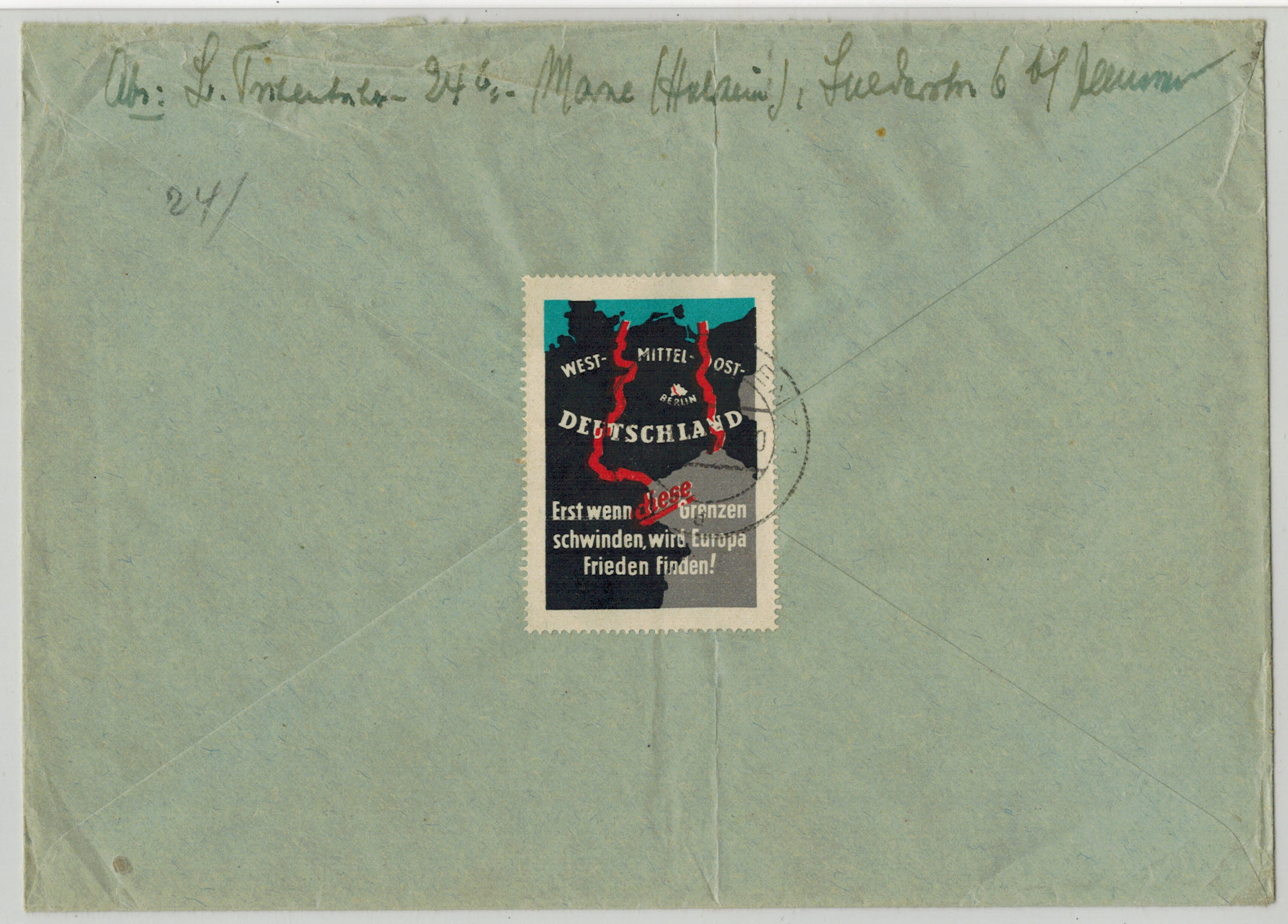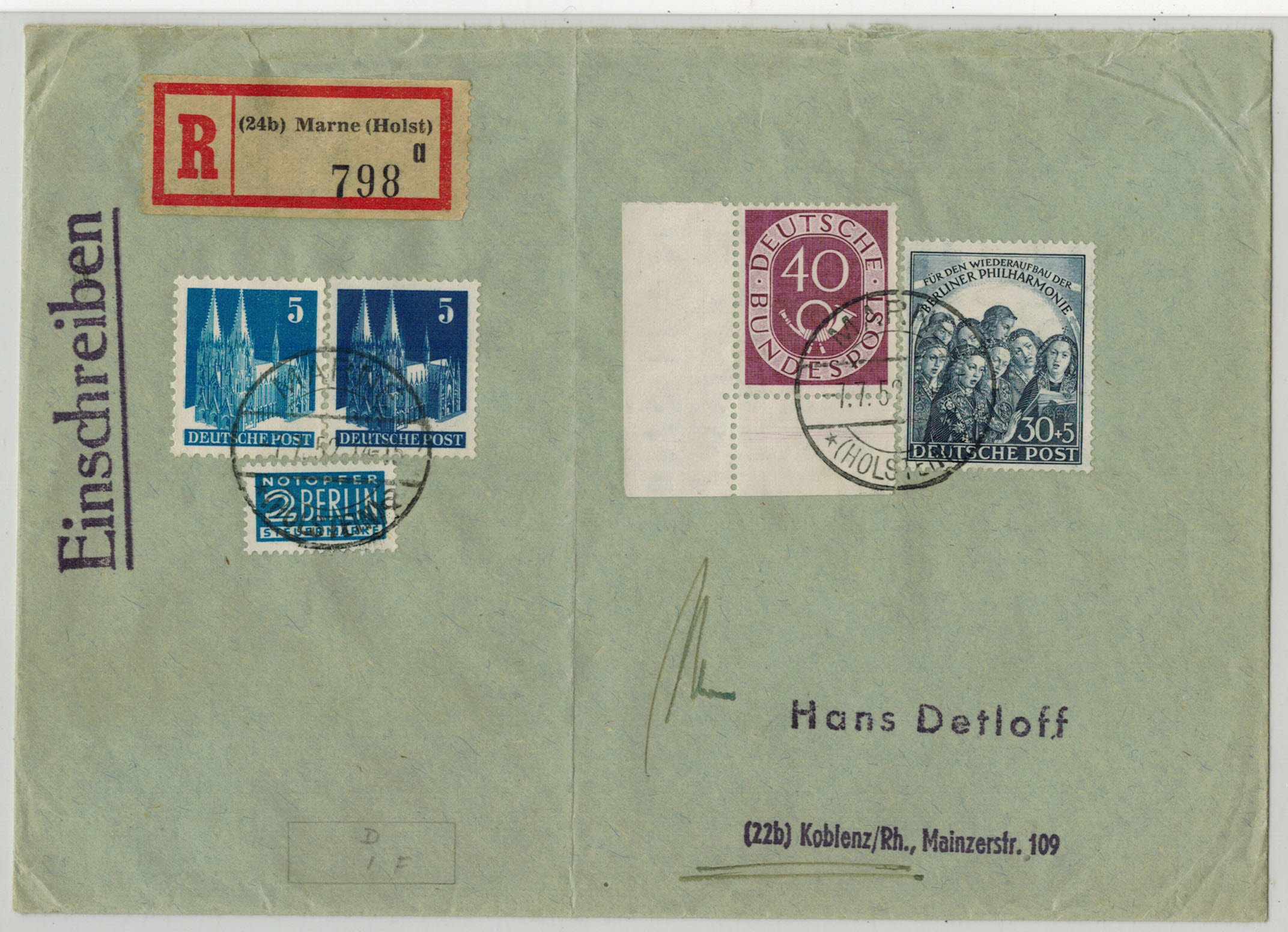 Bund 133 Eckrand links unten mit „extrem breiten Ränder und Farbschlieren im Unterrand“ auf portogerechtem Einschreibenbrief mit Notopfermarke ! Außerdem Berlin Nr.73 und Zusatzfrankatur in zwei verschiedenen Farben ! Stempel „7.7.52 14-15“ von Marne nach Koblenz. Brief mittig gefaltet.