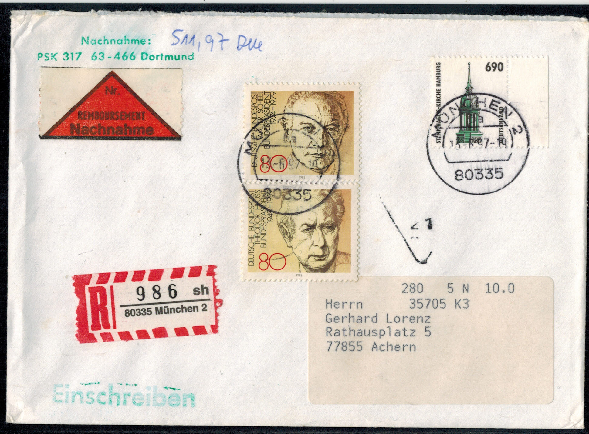 Bund 1399 5-senkrechte Zweierstreifen als MeF auf portogerechten Einschreibebrief !!
