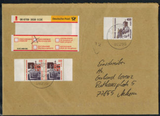 Bund 1399 5-senkrechte Zweierstreifen als MeF auf portogerechten Einschreibebrief !!