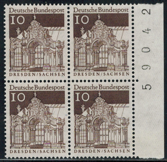 Bund 499 senkr. 4-er Block-Paar r. mit BZN nach aussen