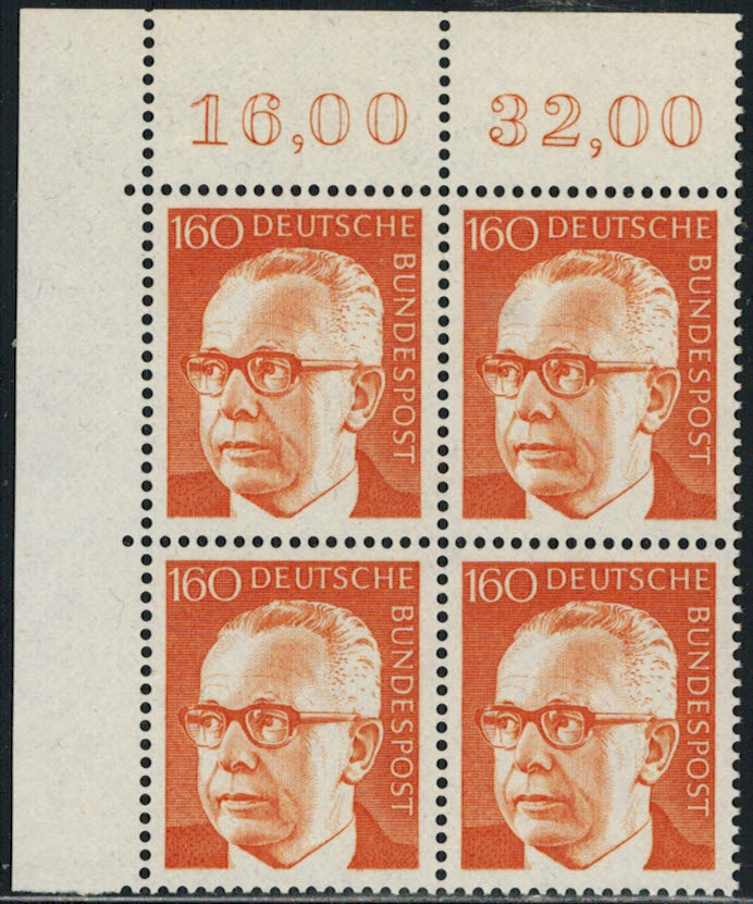 Bund 730 Eckrand 4-er Block links oben postfrisch