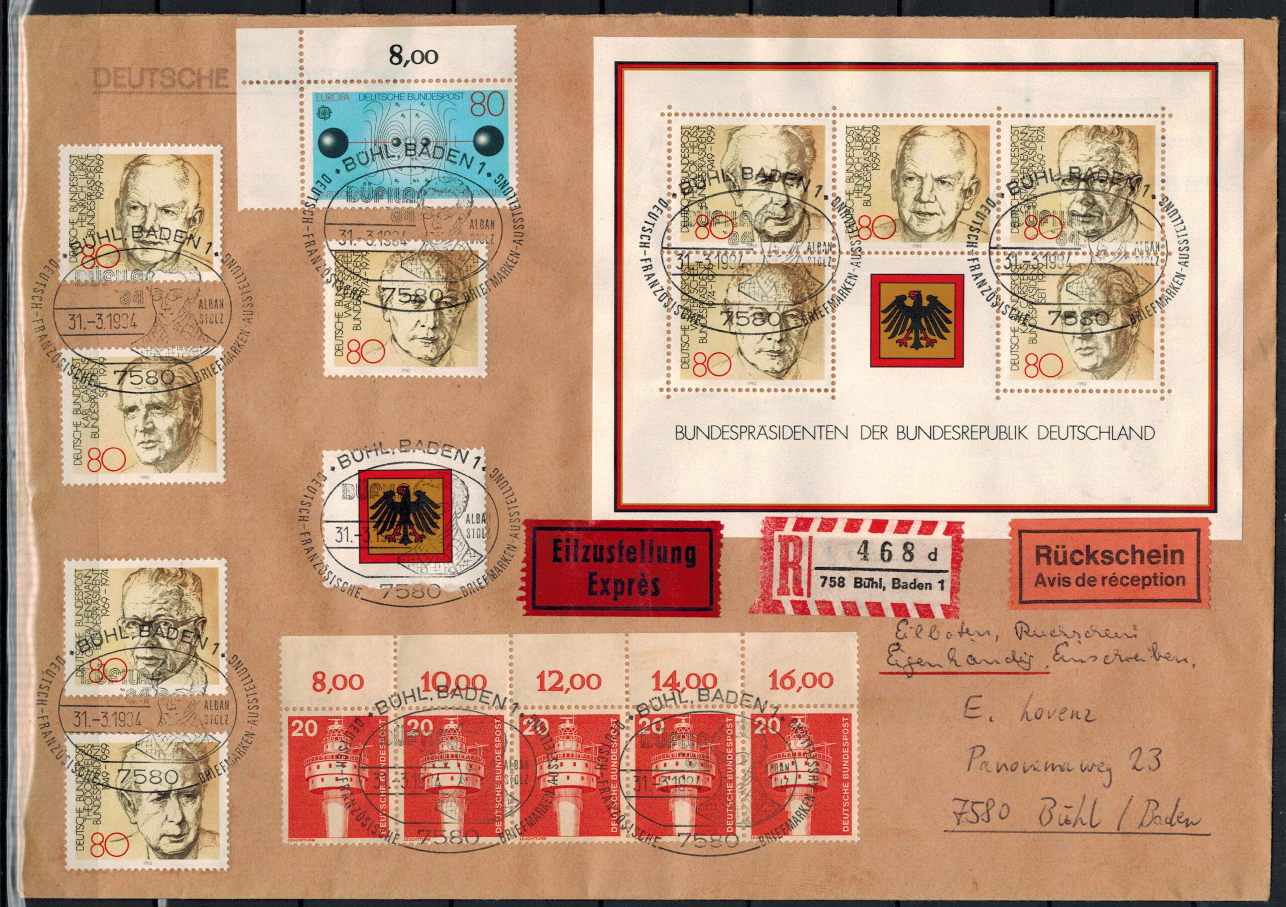 Bund Block 18 + einzelne Blockmarken als MiF auf wunderschönem portogerechtem „Eilboten, Rückschein, Eigenhändig Einschreibenbrief“ !