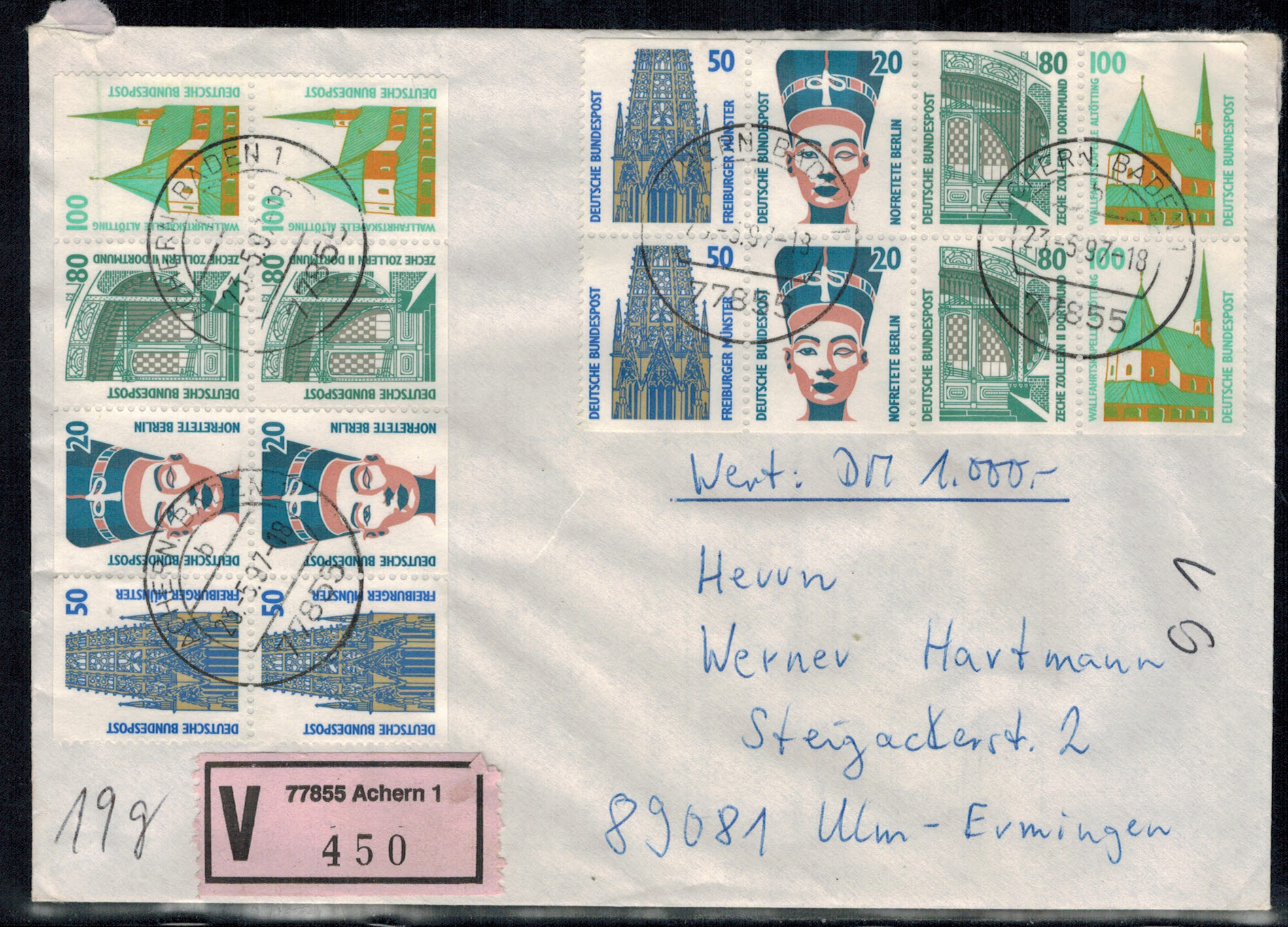 Bund 1901 5-er Block mit Plattenfehler auf der 3. Marke als MeF auf Wertbrief !!!